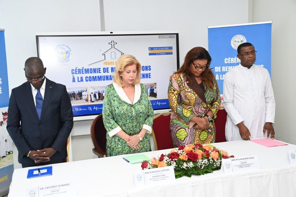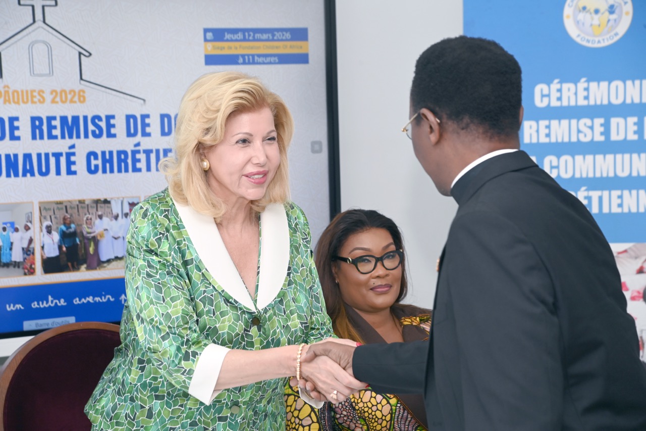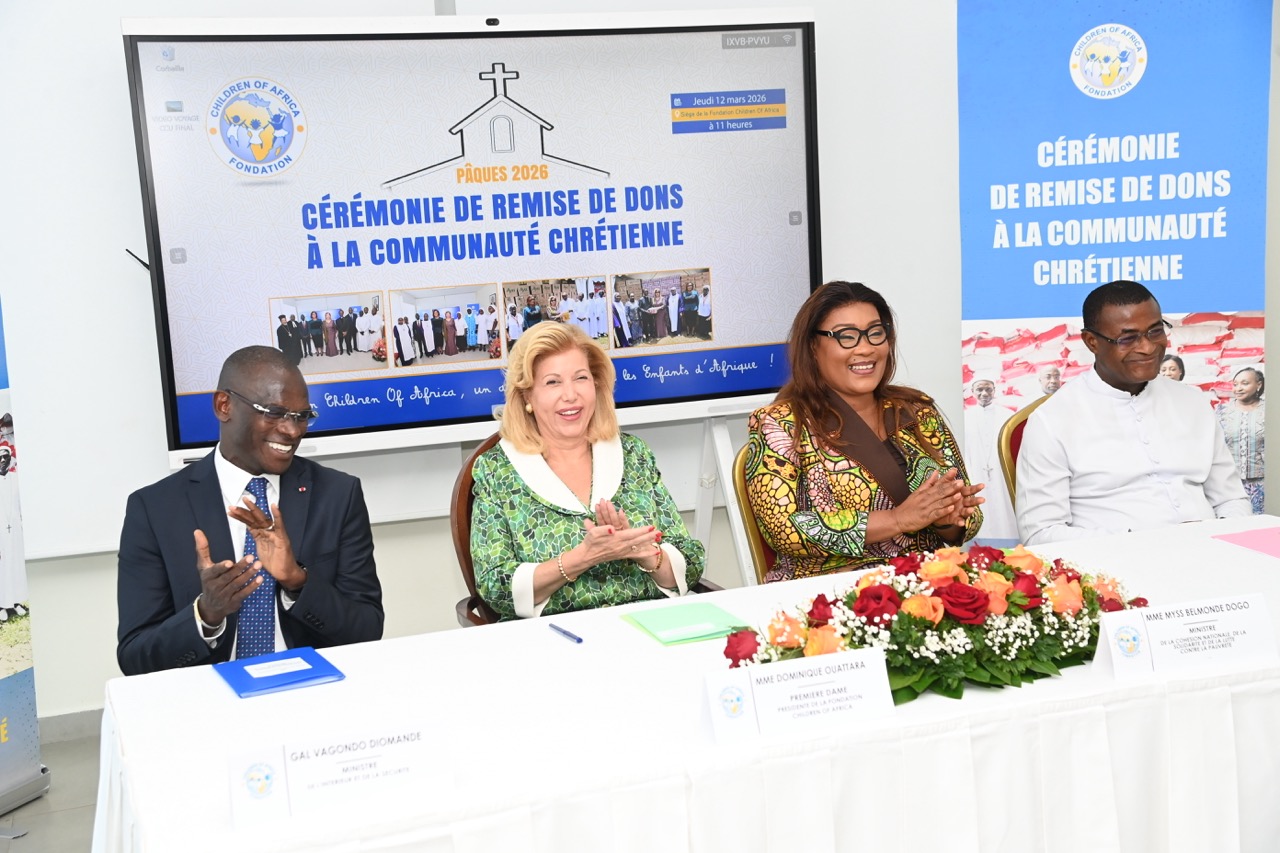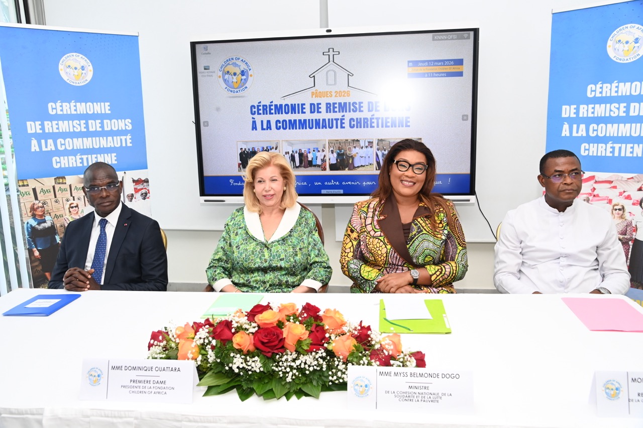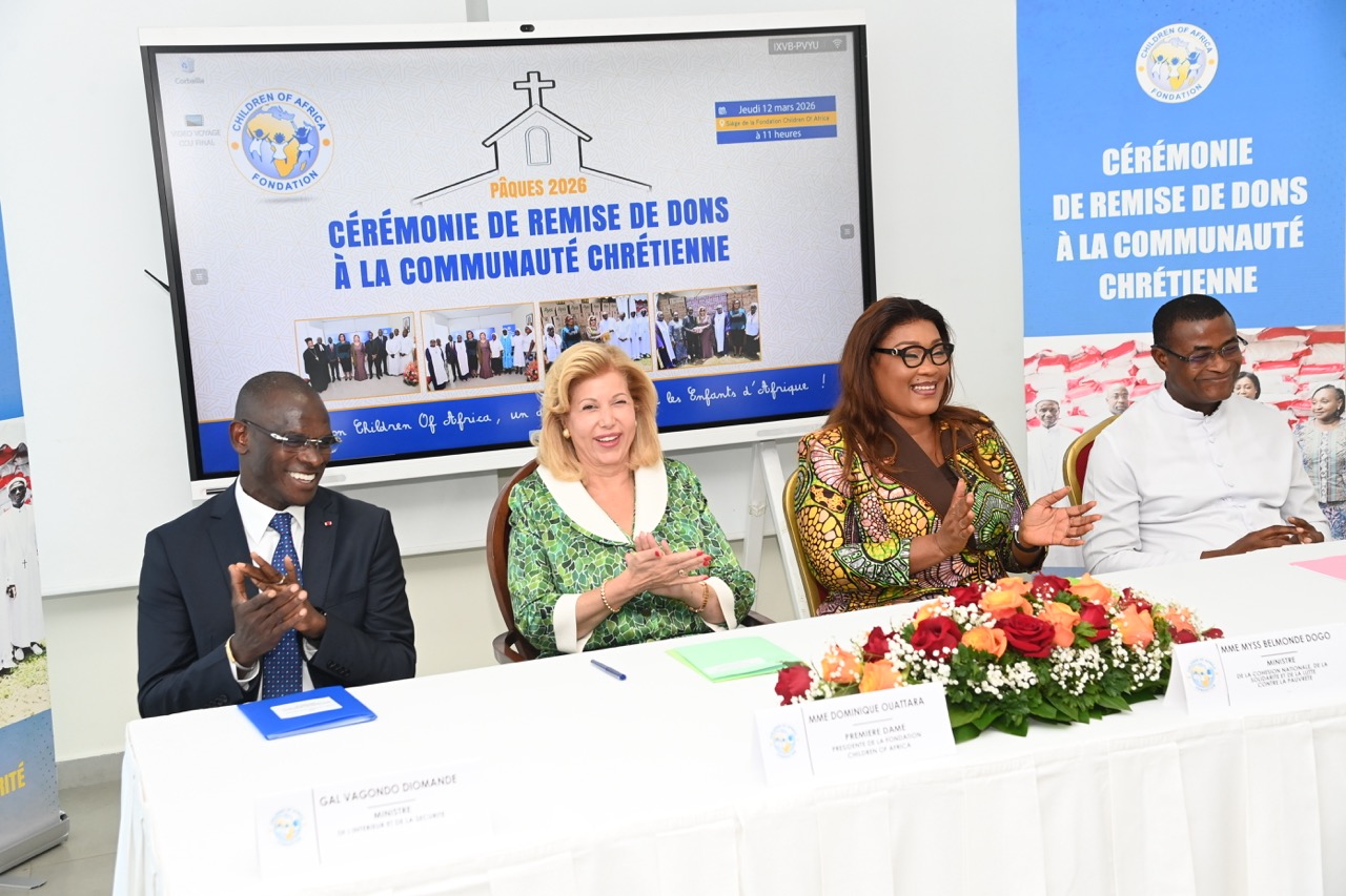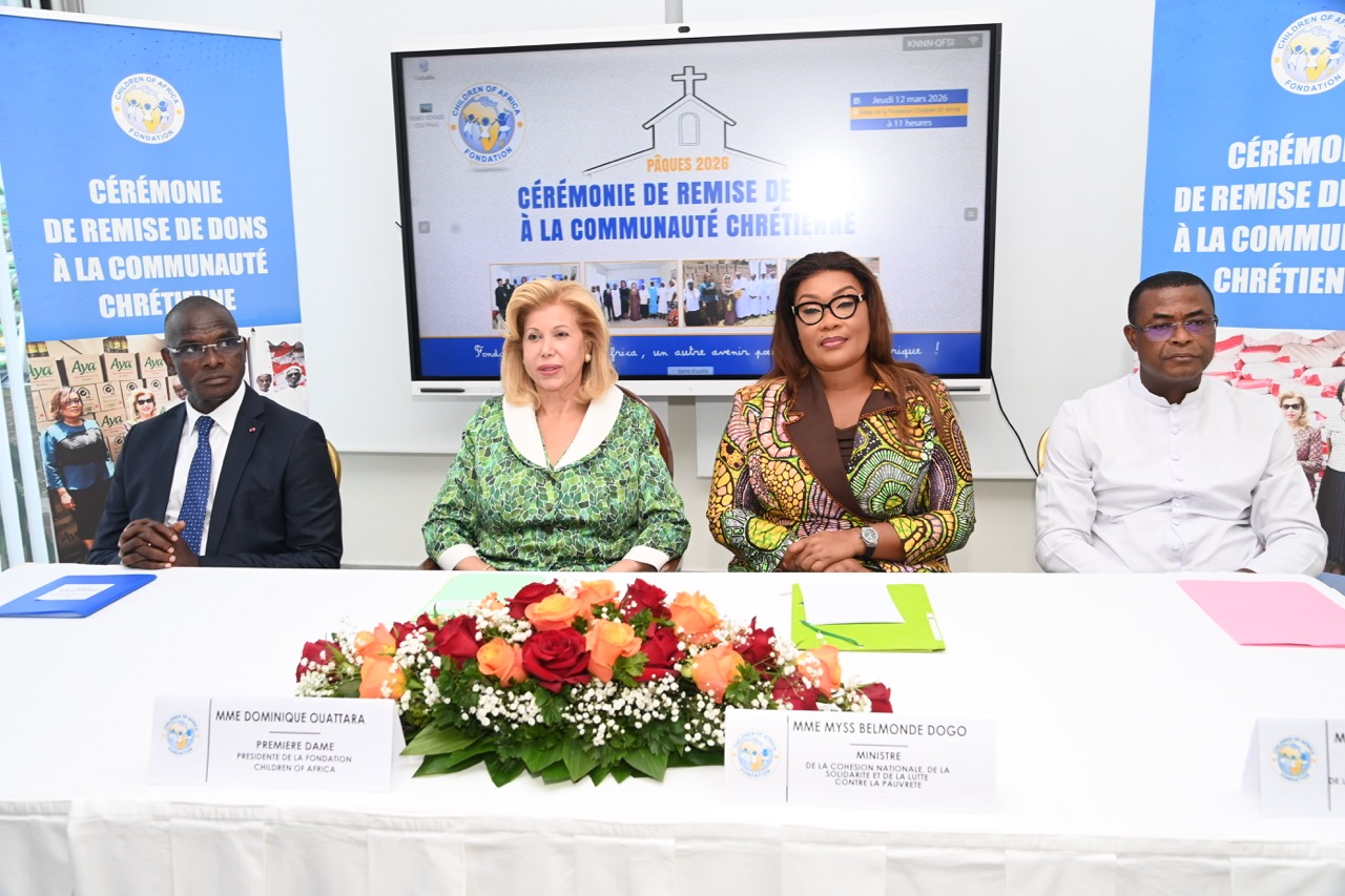 La Première Dame, Madame Dominique Ouattara, Présidente de la Fondation Children Of Africa, a présidé ce jeudi 12 mars 2026, au siège de la Fondation Children Of Africa à Cocody, la traditionnelle cérémonie de remise de dons à la communauté chrétienne de Côte d’Ivoire. Cette action de solidarité, organisée à l’occasion du temps de carême, a permis d’offrir des vivres d’une valeur globale de 130 millions de FCFA destinés aux familles les plus vulnérables.