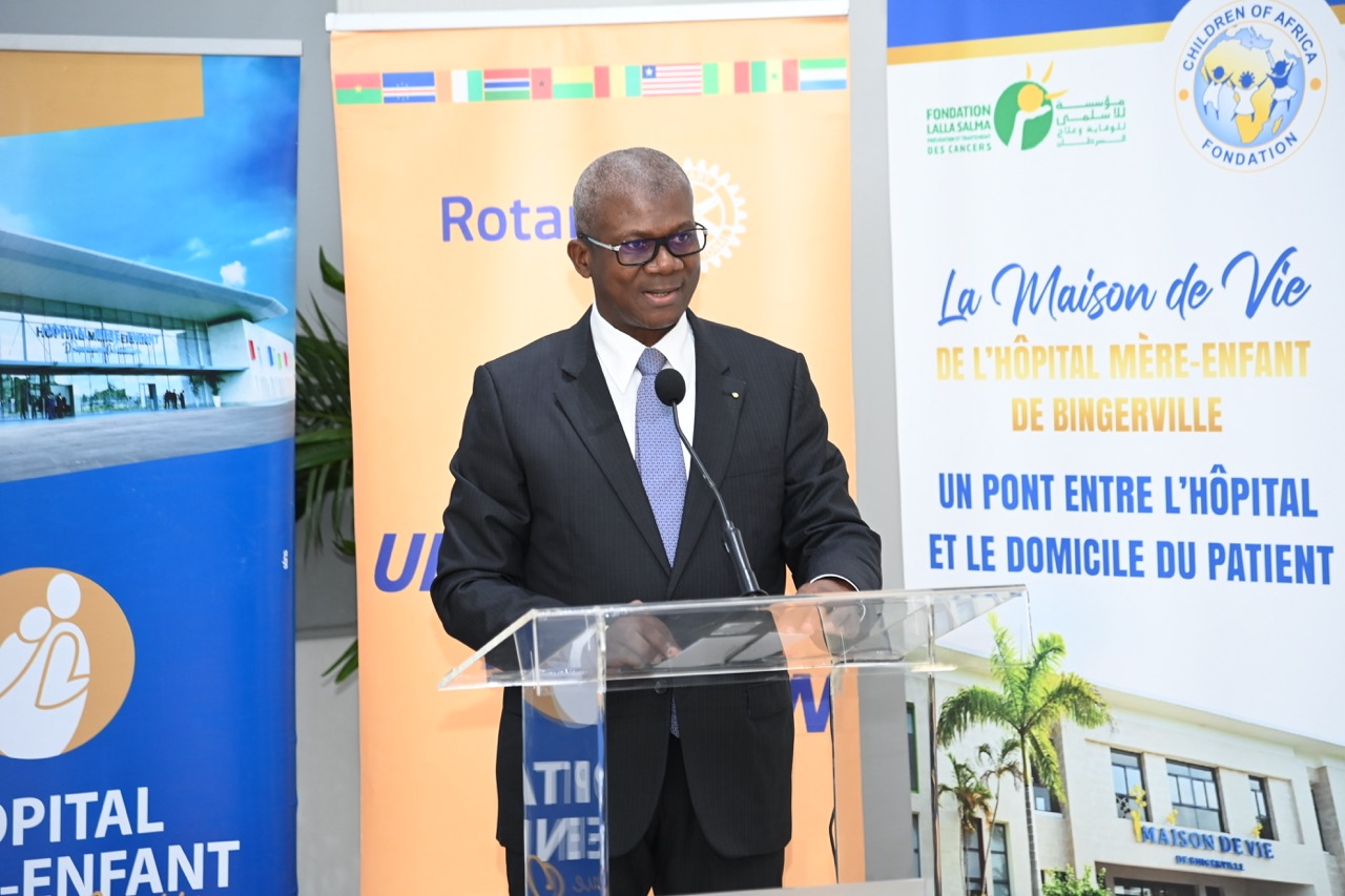 Monsieur Abou-Bakar Ouattara, Gouverneur du District 9101 du Rotary International, a salué l’engagement de Madame Dominique Ouattara au profit des populations démunies. Aussi, il a tenu à la féliciter pour son leadership et le modèle inspirant qu’elle représente pour le Rotary. En outre, Monsieur Abou-Bakar Ouattara a rappelé qu’il a placé son mandat sous le parrainage de Madame Dominique Ouattara. C’est pourquoi, il a tenu à rassurer la First Lady du Rotary Club à accompagner les actions de cette dernière au profit des personnes vulnérables. Revenant sur les missions du club service, il a révélé que le Rotary est une organisation de leaders bénévoles qui œuvre pour le bien-être des populations. A ce titre, selon lui, la question de la santé de la mère est l’une des priorités du Rotary. En effet, pour ce dernier : « protéger la mère, c’est protéger l’enfant ». Aussi, il a insisté sur les similitudes entre la Fondation Children Of Africa et le Rotary. Monsieur Abou-Bakar Ouattara a terminé son discours